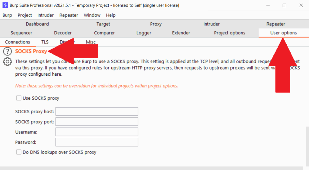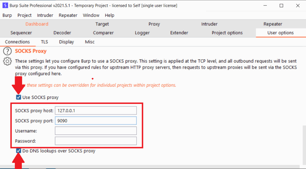 5) If testing a remote internal application, and testing is being done via hostname, check the “Do DNS lookups over SOCKS proxy”. This will override the default host lookup process and direct DNS requests for the hostname through the proxy. As a result, hostname requests will be performed on the internal network instead of over the internet or on using whatever name resolver the consultant has configured.